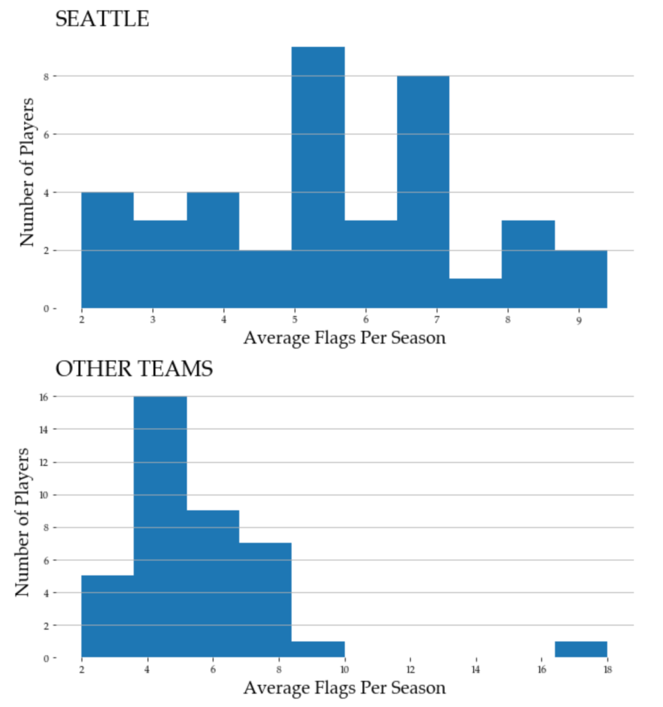 The following two histograms show the breakdown of average penalties called against this subset of players when they are playing for Seattle and when they are on other teams.